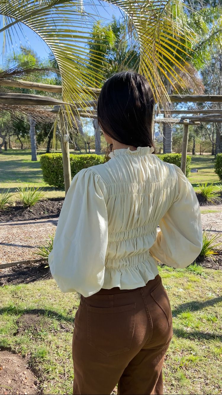 Blusa campesina confeccionada en tusor, un algodón ligero y suave que mantiene la frescura y comodidad todo el día. Cuenta con frunces en el torso y mangas largas.